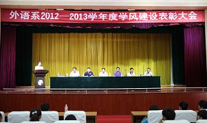 7月2日下午,外语系2012-2013学年度学风建设表彰大会在江南校区大礼堂隆重举行,系主任哈红光、党总支书记李延福、大学英语教学部主任李继平、副主任张哲华、辅导员杨厚东及全系500余名学生参加了表彰大会,大会由系学工办主任任森龙主持。