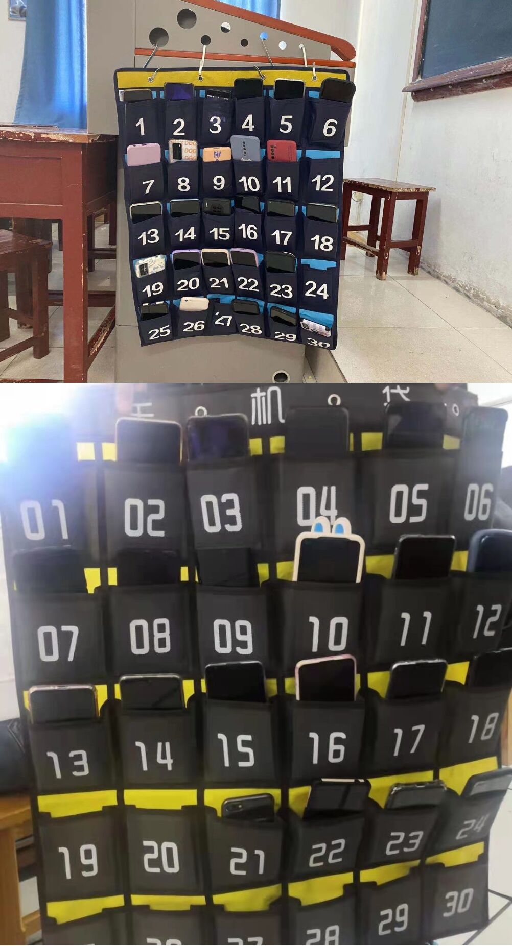 “五一”收假后,当学生陆续走入教室,准备上课,发现教室里出现了小小的变化,一个个口号响亮,主题鲜明的布袋子吸引了同学们的注意,“把手机装进袋中,把课堂放进心中”“告别手机,竞争向上”“向手机告别,与书本通行”“于学海中劈波斩浪,在生活中严于律己”学生们积极响应号召,自发征集手机袋标语。同学们自觉将手机放入教室门口墙上的手机袋中。