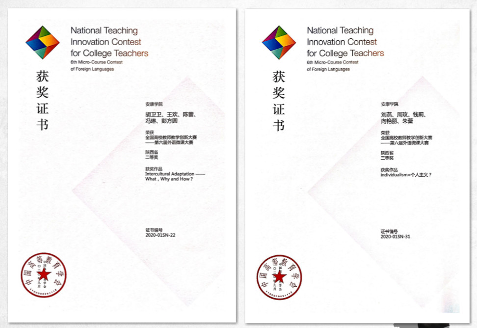 近日,第六届外语微课大赛成绩揭晓,365完美体育推荐的两个教学团队在全国各高校共计2590件参赛作品中脱颖而出:由副院长胡卫卫作为团队负责人的专业教师教学团队(成员:王欢、陈蕾、冯琳、彭方圆)和刘燕副教授带领的大学英语教学团队(成员:周玫、钱莉、向艳丽、朱蕾)分别获得了陕西省二、三等奖的好成绩。