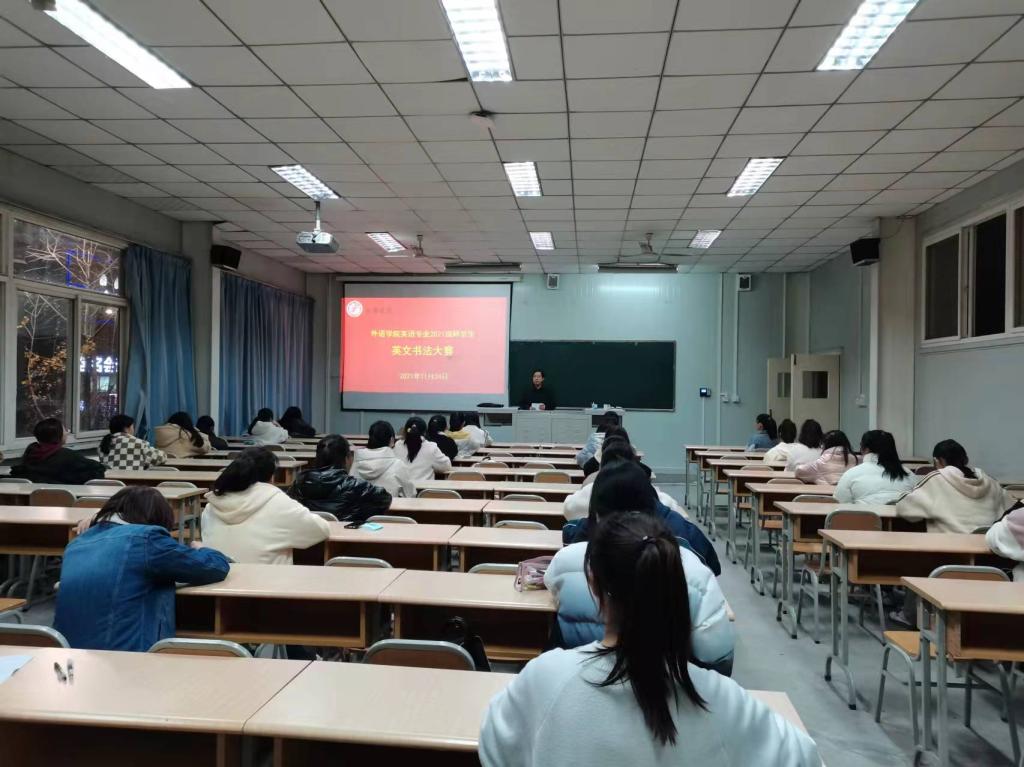 为贯彻落实应用型外语人才培养理念,促进师范生培养质量逐步提升,助力师范生以赛促学,以赛促练,增强其教师职业基本功,11月28日晚,365完美体育在1022教室举办了2021级英语专业师范生英语书法大赛。院长张哲华、副院长胡卫卫、系主任周玫、青年教师袁昌丽等担任评委。