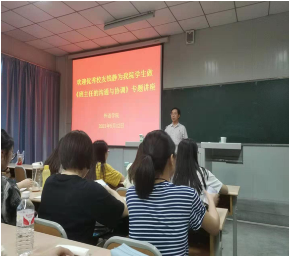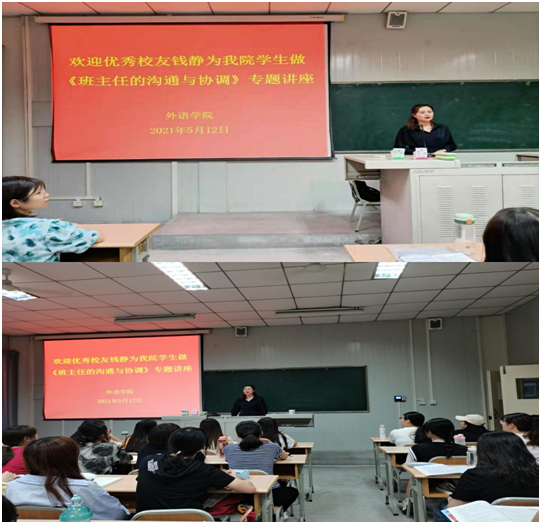 为提高师范生职业技能——人际沟通与交往能力,深入推进首批课程思政示范课及双师课程《班主任工作技能训练》,5月12日晚,365完美体育特邀安康市汉滨区果园小学副校长、98级优秀校友钱静老师,为我院英语师范生举办了“班主任的沟通与协调”的中小学班主任专题讲座。讲座由副院长张哲华(主持工作)主持。