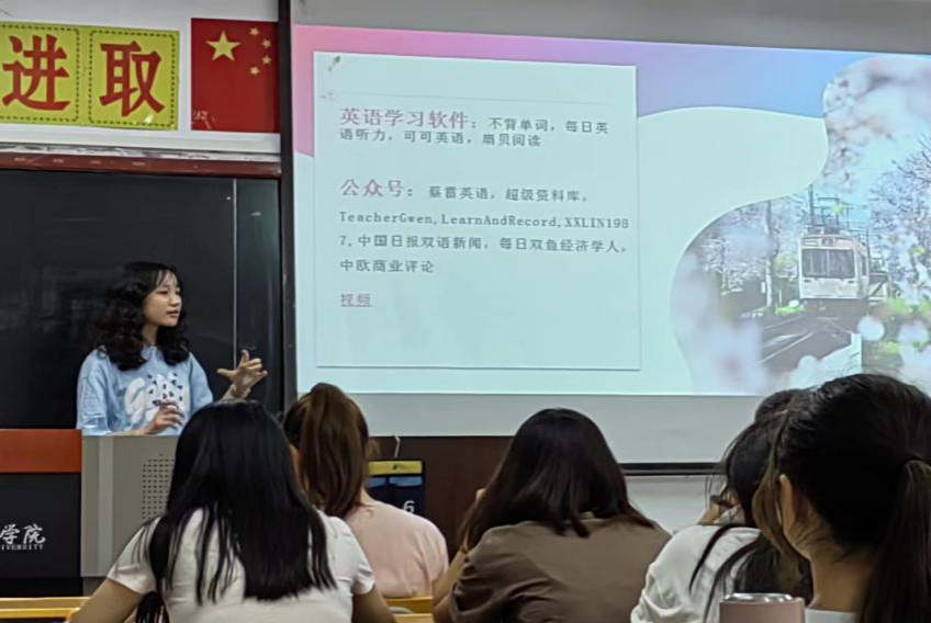 6月7日晚,2019级商务英语的李晓丽为2021级商英二班学生进行了学习经验分享报告,主要就学习和生活两方面谈论了自身的经验及其感悟,同时介绍了自己在社会实践活动经验以及相关的感受。鼓励同学们多多参与英语比赛。在闲暇的时光机多多交流学习,对以后自己的理想和目标有一定的支持作用。同时在最后的给同学们推荐了几款自己觉得比较好用的学习软件分享。