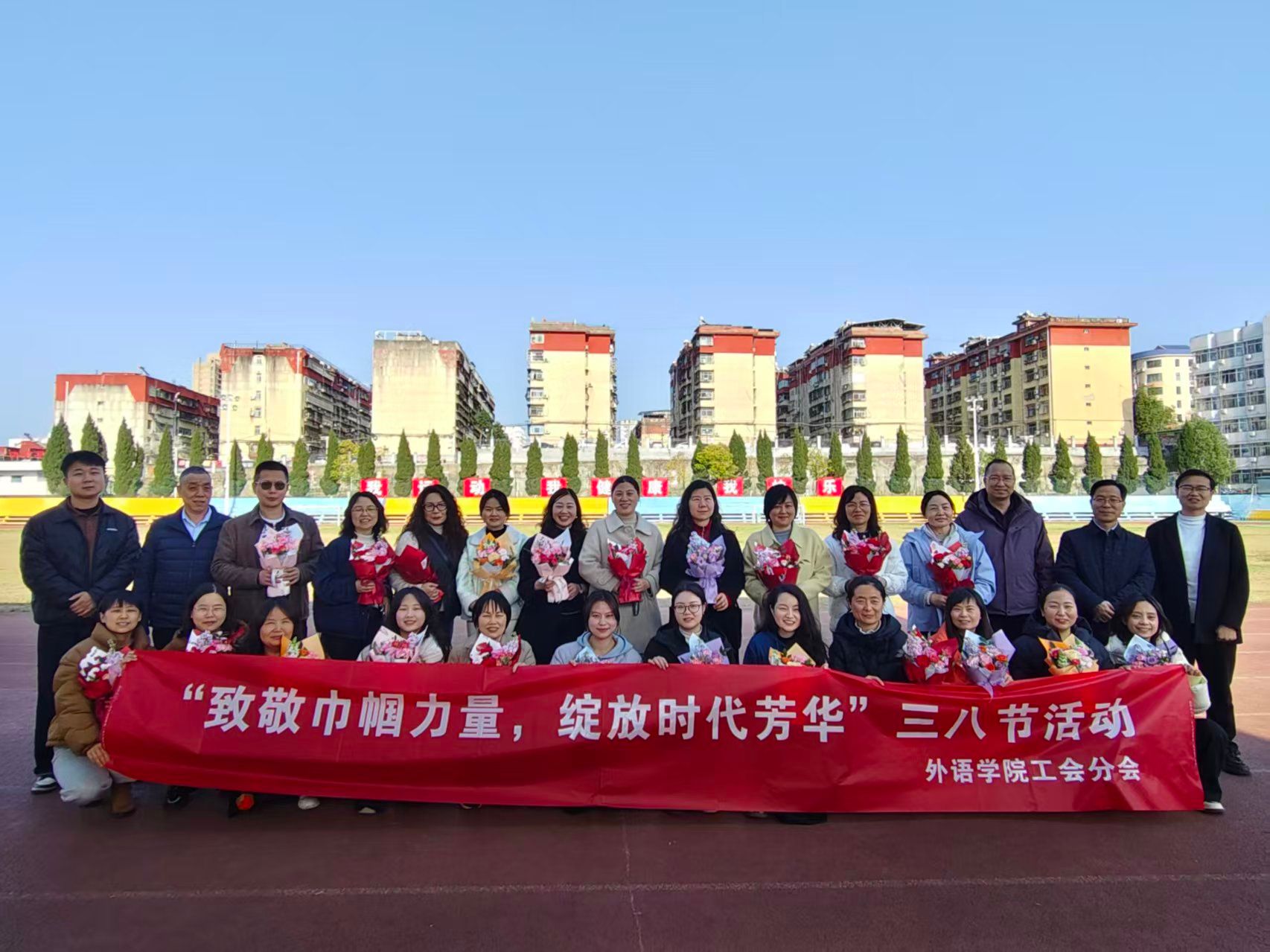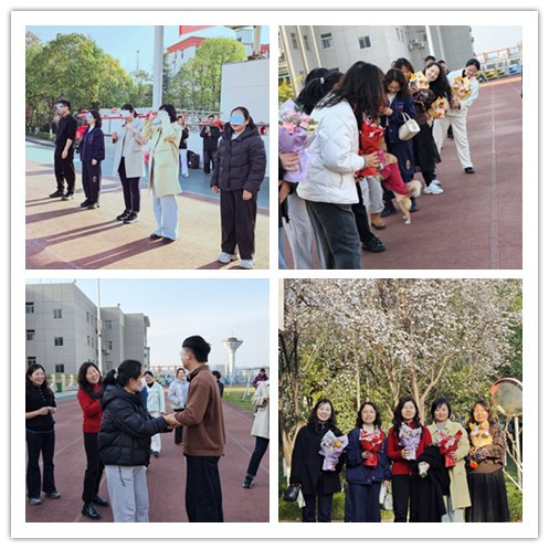 活动中,学院工会为女教职工送上精心准备的花束,以芬芳传递关怀,以花语致敬付出。接过鲜花的女教职工们笑容灿烂,花束与笑靥相映,成为操场上温暖的风景,也象征着大家对美好生活的期许与对工作的热忱。