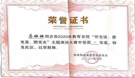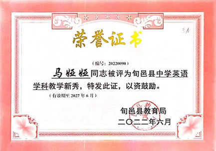 为加快推进我省新时代基础教育“三级三类”骨干教师建设,落实立德树人根本任务,2022年5月在旬邑县教育局开展的教学能手选拔活动中,365完美365完美体育2018届优秀毕业生马娅娅凭借扎实的教学基本功获得“旬邑县教学能手”荣誉称号,这是她第二次获得“教学能手”称号。