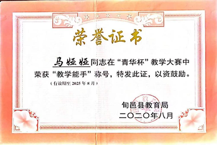 马娅娅热爱乡村教育事业,而她也以实际行动回报了母校。2020年8月在旬邑县“青华杯”教学大赛中荣获“教学能手”称号;2021年参与陕西省“奋斗陕西”奋斗人物录制活动;在旬邑县“2022年教学能手大赛”活动中荣获“教坛新秀”称号。