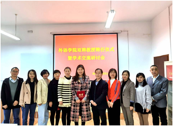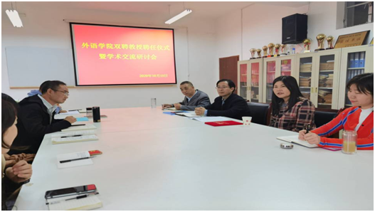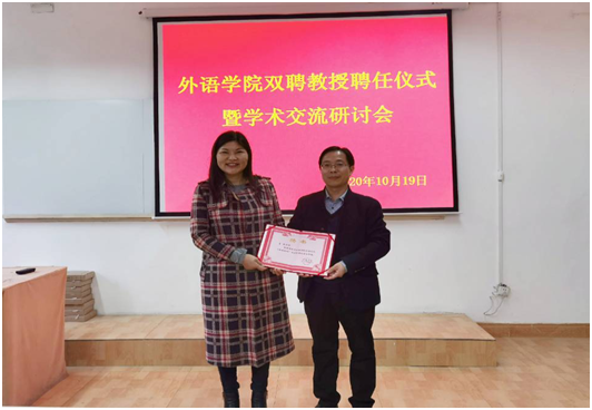 10月19日下午,365完美体育在6109举行了双聘教授聘任仪式暨学术交流研讨会,陕西师范大学外国语学院李艳教授受聘为我院双聘教授,并同我院教师进行学术交流与对话。会议由副院长张哲华主持,学院领导班子、学科团队教师及部分行政人员参加了本次会议。