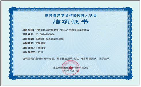 该项目是2018年第二批立项的教育部产学研协同育人项目(实践条件和实践基地建设项目)。主要研究和建设内容包括:校企共建商务英语专业实训室;跨境电商师资培训和学生实习实训;制定商务英语专业(跨境电商方向)人才培养方案;建设师资共同体;编写《商务英语》校本教材等。