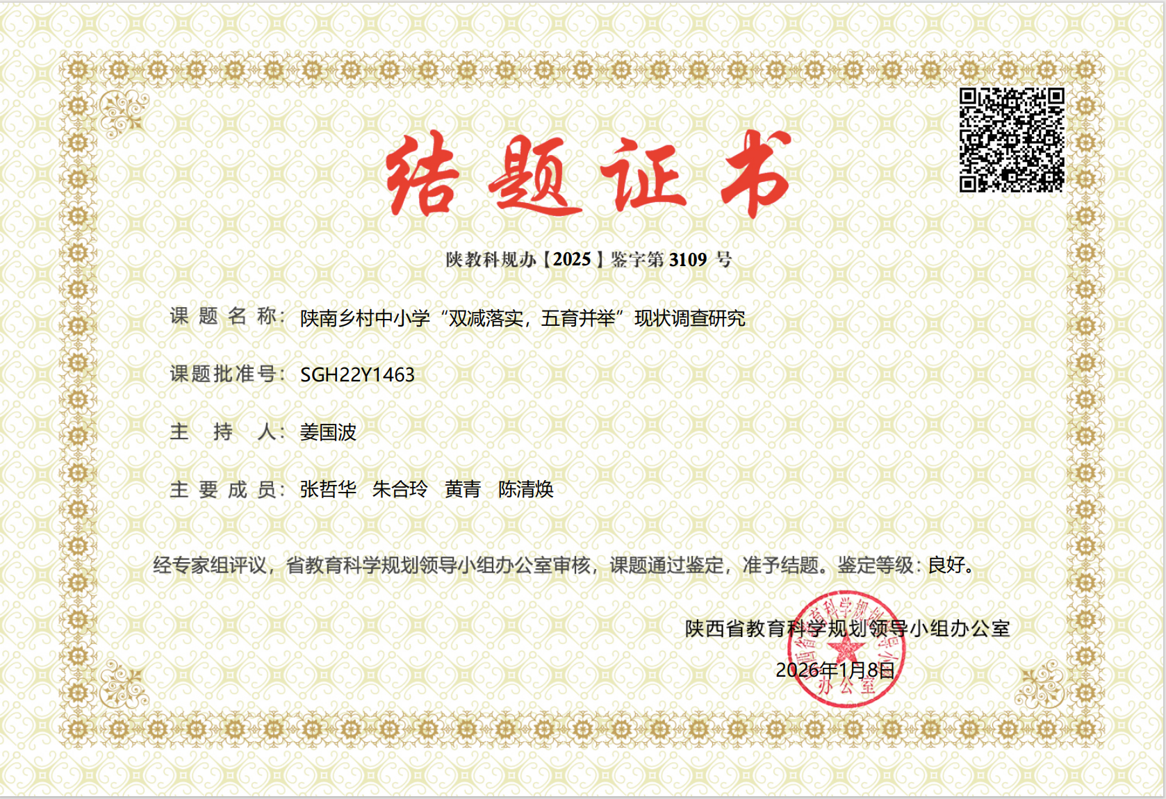 近日,陕西省教育规划办公布了2025年第四期陕西省教育科学规划课题结题名单,我院教师姜国波主持的“陕南乡村中小学“双减落实,五育并举”现状调查研究”和徐雯主持的“乡村振兴政策背景下陕南乡村青年教师职业认同调查研究”均以良好级别结题。