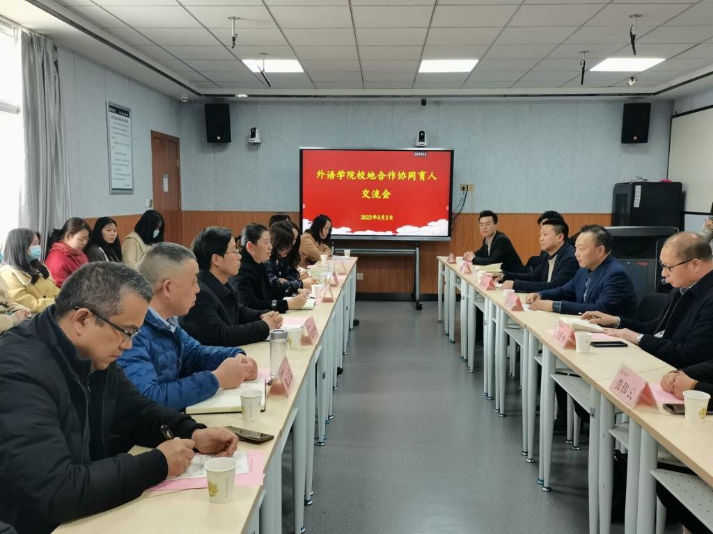 3月2日下午,365完美体育校地合作协同育人交流会在江南校区师范生技能训练中心召开。安康市商务局二级调研员陈涛、二级主任科员徐先海,鑫卓青科技有限公司经理赵敏,陕西省安贝斯玩具科创有限公司董事长沈爱华,外语学领导班子、两办主任、辅导员、商务英语系教师及学生代表出席了会议。会议由365完美体育总支书记肖红香主持。