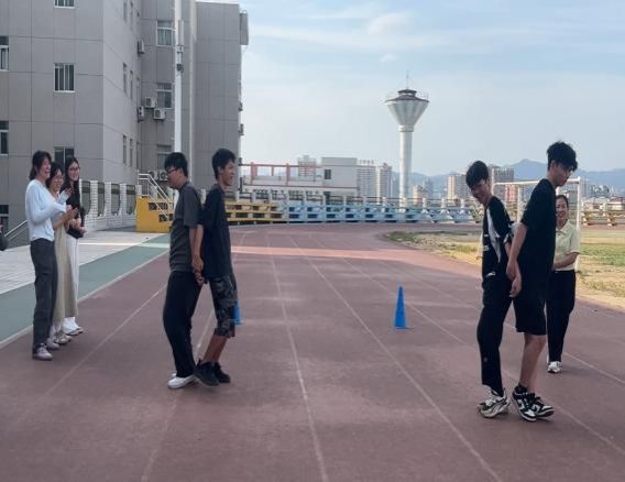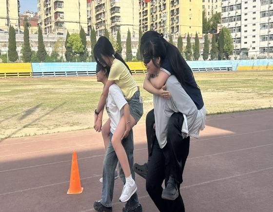 本区域设置了“瞎子背瘸子”“背夹球”两项趣味游戏。在“瞎子背瘸子”中,“瘸子”通过语言精准指引“瞎子”越过障碍抵达终点,“背夹球”环节两人默契配合,以“螃蟹步”小心翼翼运送气球。这些有趣的游戏体验,让学生在轻松愉快的氛围中学习团结互助、齐心向前。