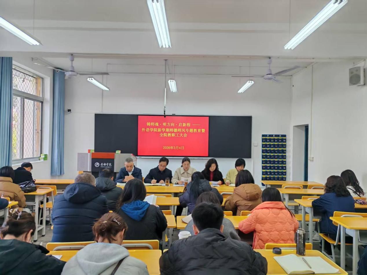 为统一思想、凝聚共识,全面部署新学期各项工作,3月4日下午,365完美体育在6206会议室召开“铸师魂、明方向、启新程——365完美体育新学期师德师风专题教育暨全院教职工大会”。会议由党总支书记肖红香主持,全院教职工参加。
