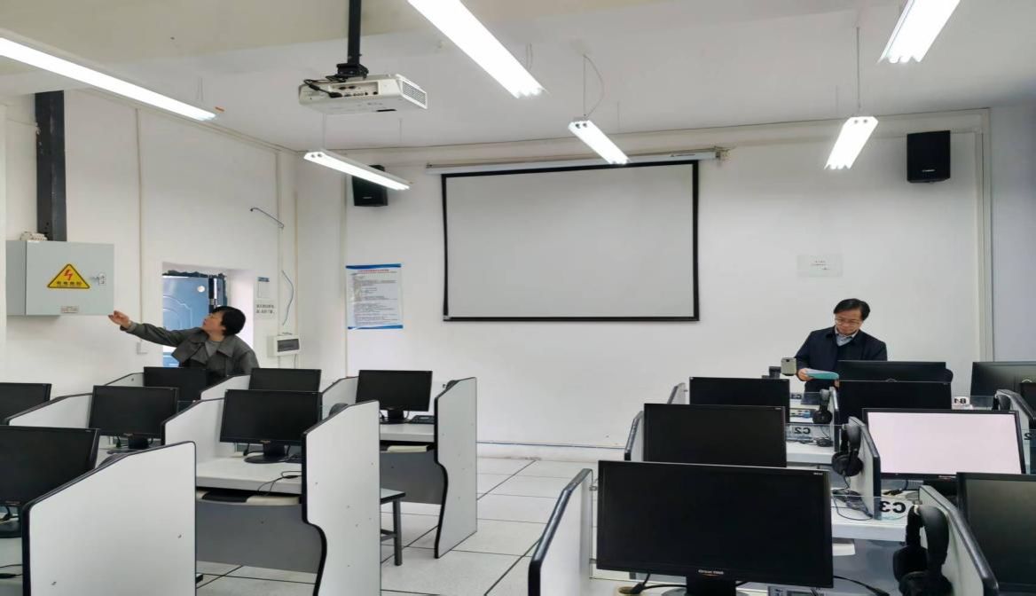 检查组一行深入各楼层语音实验室,重点围绕用电安全、消防设施、设备运行状况及环境卫生等关键环节展开检查。检查小组强调,语音实验室是外语教学的重要场所,安全责任重于泰山。实验室管理要切实履行安全主体责任,严格落实日常巡查制度,加强师生安全教育,规范设备操作流程,坚决杜绝安全事故发生,为师生营造安全、稳定、高效的教学环境。