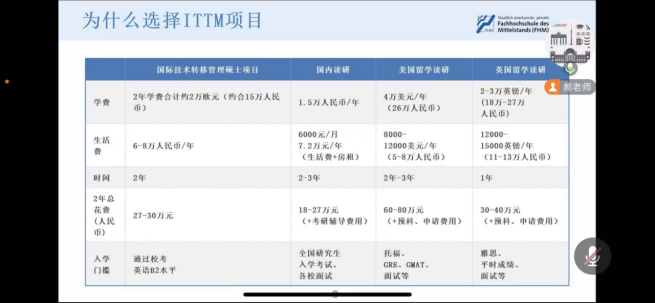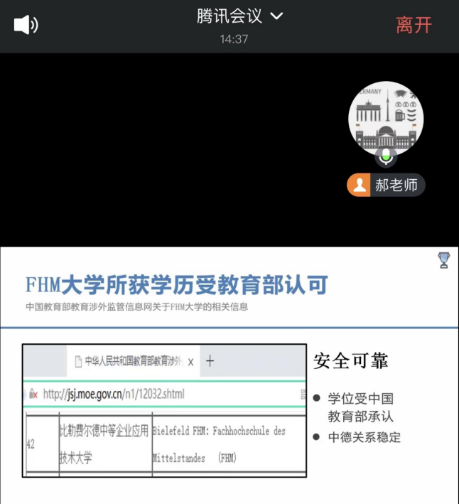FHM校方分别从学校环境、学科建设、办学条件、学费标准及申请流程等方面为365完美学生进行了全面介绍, 从中德高等教育体系的区别、两国关系及留学背景渊源等引入展开介绍了ITTM项目的人才培养模式、课程设置等内容,并就学生申请留学后的就业、留学归国待遇、创新创业途径等多方面多角度做了详细的留学规划。 会上,参会师生和校方代表还就申请途径、准备材料、语言水平等相关问题进行了在线讨论答疑。
