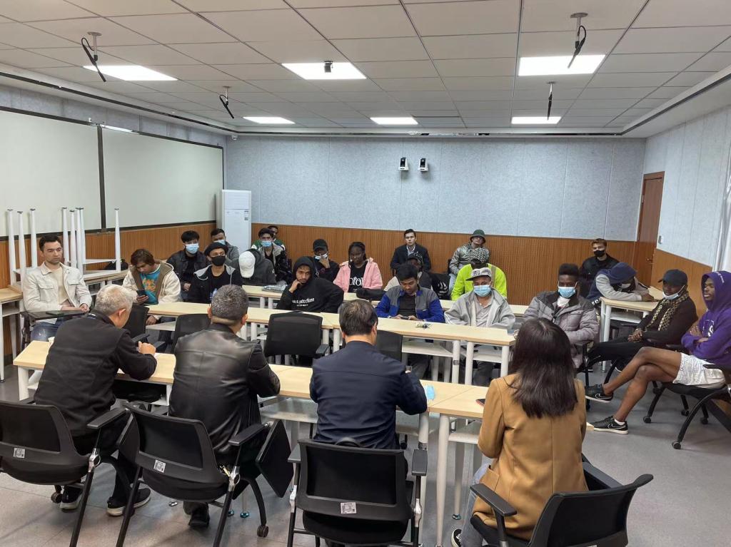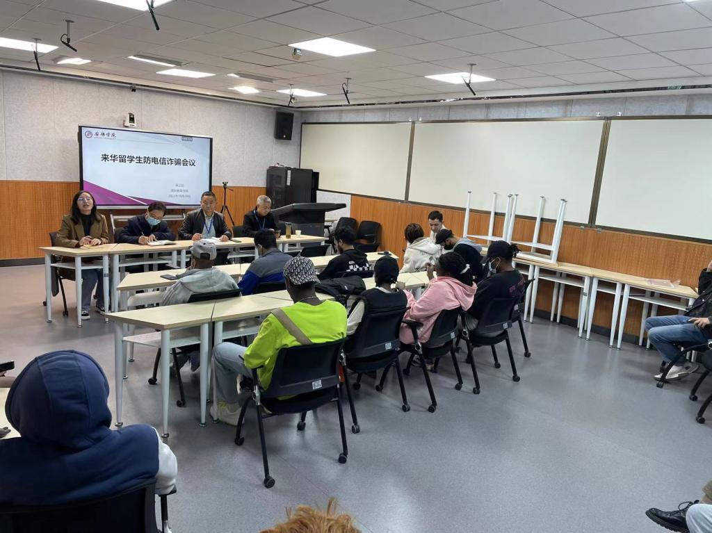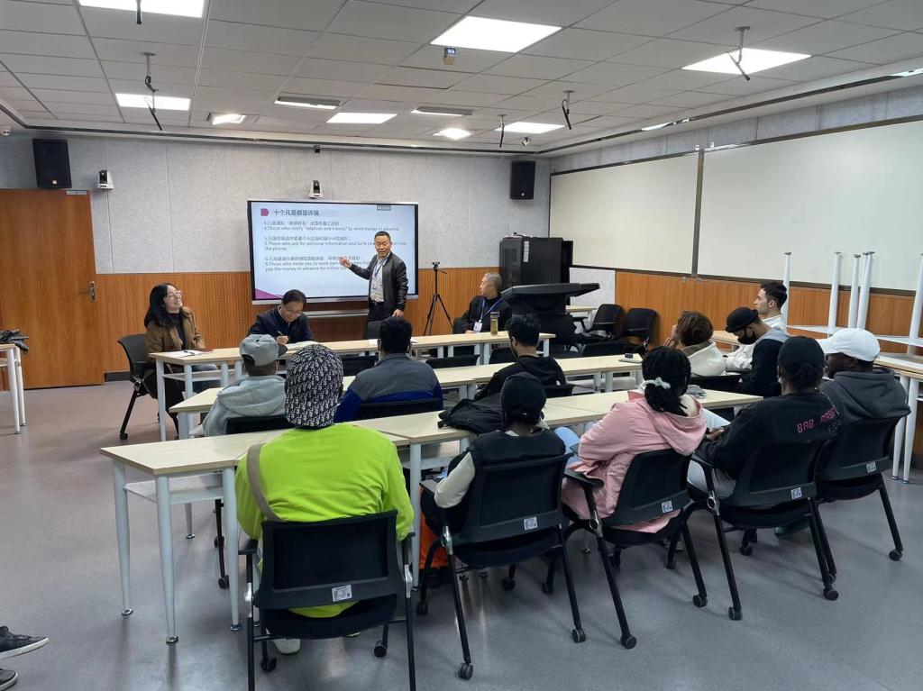张哲华做总结讲话。他号召全体留学生要主动下载国家反诈中心客户端,学习防范、反诈知识,提高防范意识;要主动学习、严格遵守校纪校规、法律法规,遵守疫情防控管理规定;要认真学习领会中华文化,讲好中国故事,做好两国文化交流的使者。