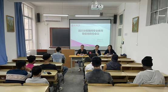 根据安康学院《关于2022年国庆节放假安排的通知》及《关于做好常态化疫情防控工作的通知》,为使留学生充分了解防疫政策,增强其履行疫情防控责任的主动性,9月30日,国际教育学院召开留学生国庆放假期间安全教育暨疫情防控会议,学院院长张哲华、副院长肖红香、副院长陈蕾、辅导员陆传梓及全体在校留学生参加此次会议,会议由陈蕾主持。