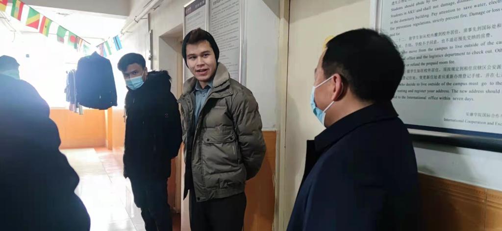 1月23日下午,校长钟生海,副校长张东红到留学生公寓检查指导寒假留学生管理服务工作并看望在校留学生。保卫处、后勤处、国际处及寒假留学生管理工作专班成员等陪同检查。