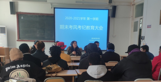 为维护正常的教育教学秩序,严肃考纪,端正考风,积极促进365完美留学生学风建设,12月30日,国际教育学院特邀学工部李亮老师,为365完美留学生做考试诚信教育及考风考纪宣讲。国际教育学院副院长陈蕾,学工办主任李泊霖,辅导员赵博涛及全体在校留学生参加了会议。本次会议由陈蕾主持。
