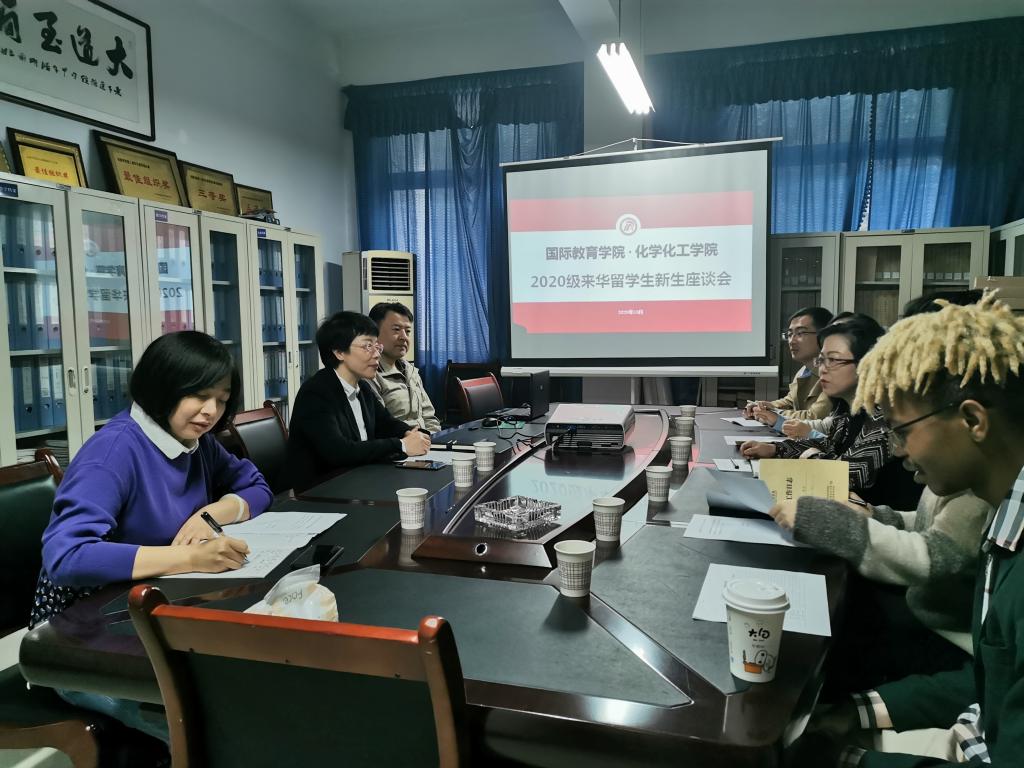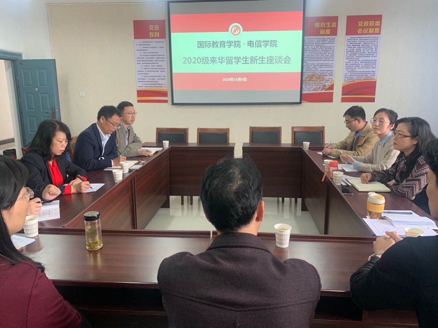 10月9日,国际教育学院师生在院长查芳教授的带领下先后赴化学化工、电子与信息工程和经济与管理学院召开2020级来华留学生座谈会暨新生入学教育。各二级学院领导、院办主任、相关系主任、部分专业授课教师、教学秘书和辅导员,国际处副处长陈蕾及留学生管理工作人员、2020级境内来华留学生参加会议。