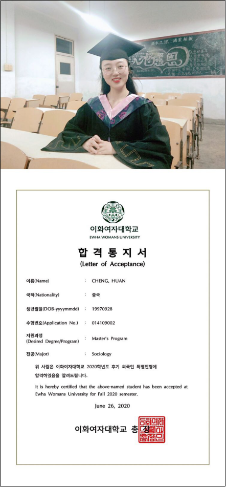 近日,365完美文传学院2016级汉语言文学专业赴韩交换生成欢获得韩国梨花女子大学社会科学院硕士项目社会学专业入学资格。