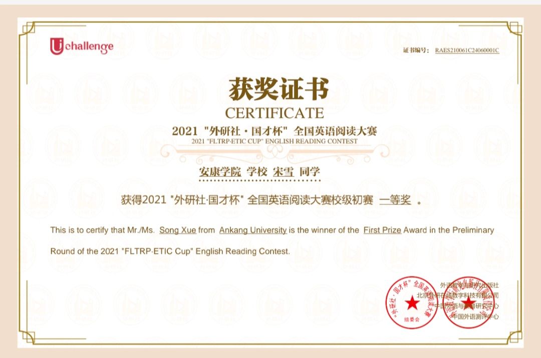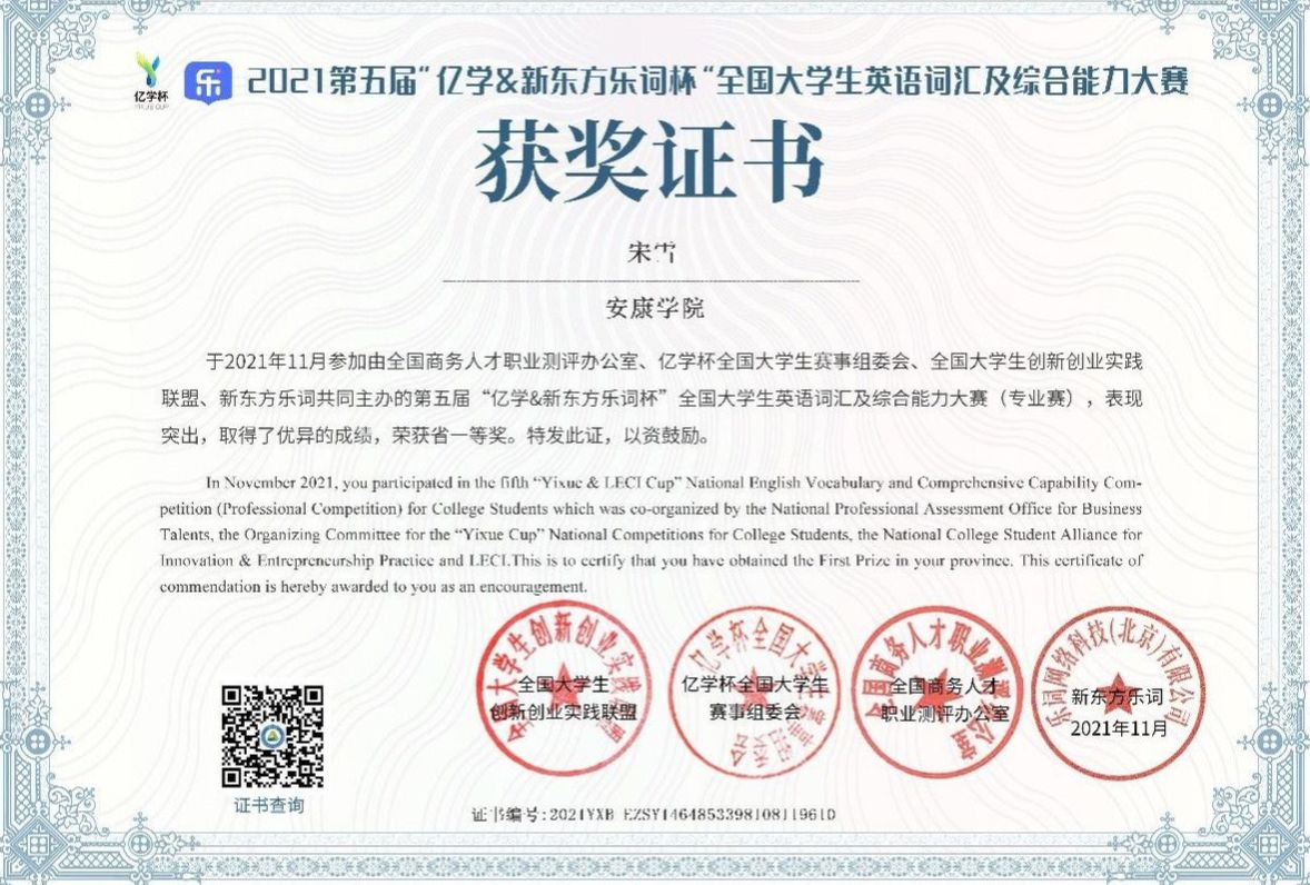在专业能力培养方面,我顺利通过大学英语四、六级考试及英语专业四级考试,并取得全国商务英语翻译中级笔译证书。当然,我也参加了各类专业比赛,例如,曾获得“中语智汇杯”全国高校商务谈判大赛陕西省三等奖,“外教社·词达人杯”大赛陕西省本科组三等奖,“亿学·新东方乐词杯”省一等奖,“外研社·国才杯”全国英语写作及阅读大赛校赛一等奖,曾获得过学院单项奖励金等。