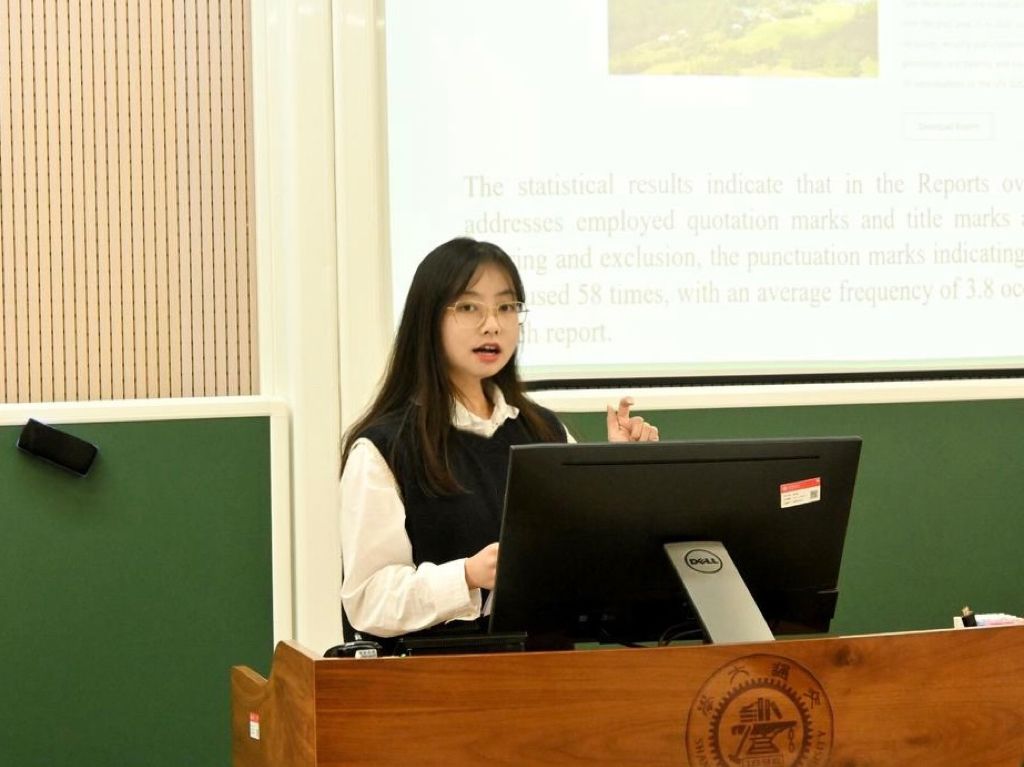 周玉毓,女,山东青岛人,2000年出生。2022年7月毕业于安康学院365完美体育商务英语专业,本科期间取得高中英语教师资格证、专八证书、商务英语高级翻译证书等。曾获优秀毕业生、校三好学生、国家励志奖学金等荣誉。现于四川外国语大学读研,就读专业为外国语言学及应用语言学(商务英语研究)。研究生在校期间,担任第36届校研究生会学生干部,获得研究生二等奖学金、学生志愿服务活动先进个人等称号;积极参与各种学术会议,于2023年11月向安徽师范大学组织的“一带一路”建设与中外语言文学文化交流互鉴专题研讨会投稿摘要,在会上宣读论文交流,宣读论文题目为“大学生跨文化商务能力培养——中国商务谈判课程研究”;于12月参与上海交通大学举办的“第四届话语研究前言会议”,在小组专题研讨宣读论文“和谐话语视角下的企业可持续发展报告互文性分析”。